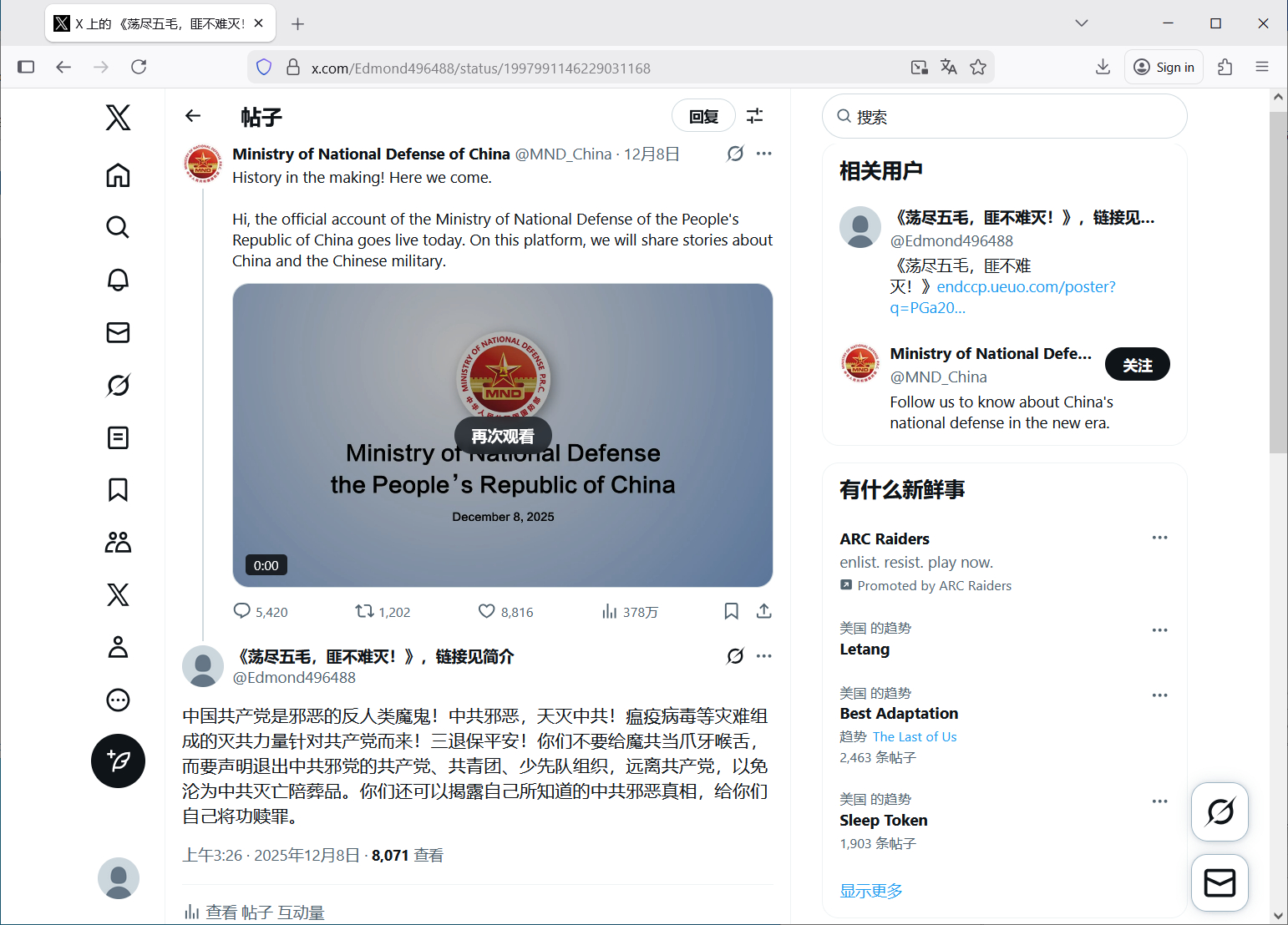 中国共产党是邪恶的反人类魔鬼!中共邪恶,天灭中共!瘟疫病毒等灾难组成的灭共力量针对共产党而来!三退保平安!你们不要给魔共当爪牙喉舌,而要声明退出中共邪党的共产党、共青团、少先队组织,远离共产党,以免沦为中共灭亡陪葬品。你们还可以揭露自己所知道的中共邪恶真相,给你们自己将功赎罪。 原评论网址可见:https://x.com/Edmond496488/status/1997991146229031168 ; |